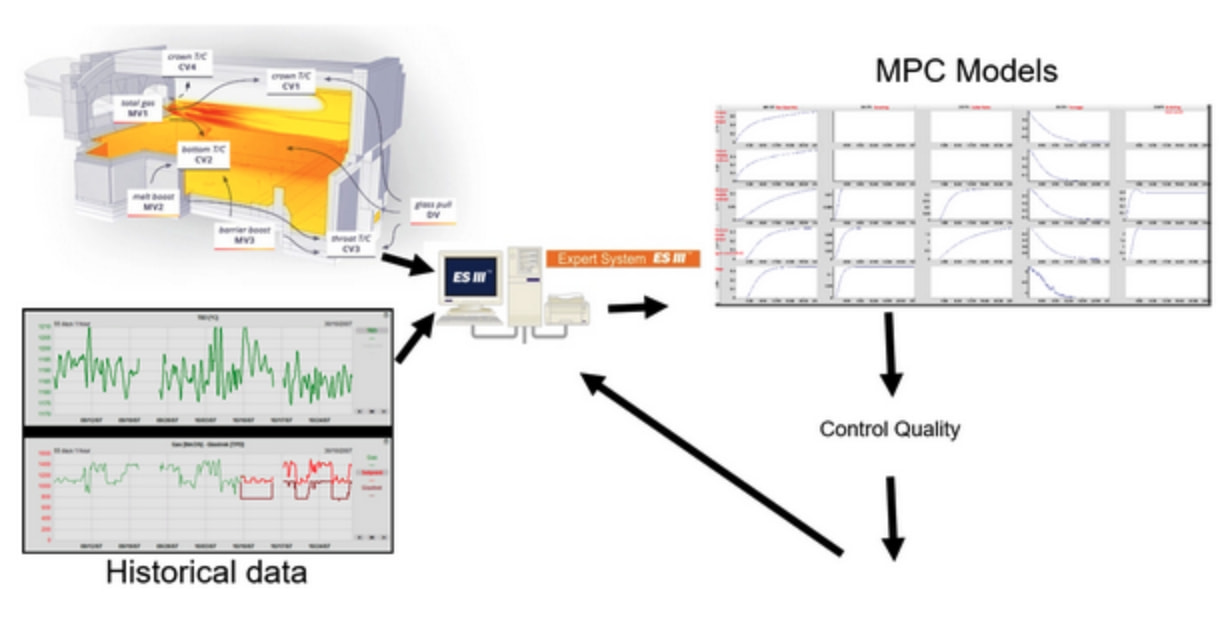 ガラス溶解炉の制御ではフィードバック制御が一般的ですが、溶融ガラスの低い熱伝導率、高粘度により、入力(例えば、燃焼ガス量を増やす)→出力(ボトム温度の上昇)は非常に反応遅いため、制御が難しくなっております。ESⅢでは数週間の炉の操業データをコンピューター解析し入力と出力の時間関数を計算します。それにより、入力による出力への影響を予測し、フィードフォワード制御が可能となり、安定的な操炉が可能となります。この制御技術は現在、世界中で約200炉に採用されており、大幅な省エネと品質向上に貢献しております。