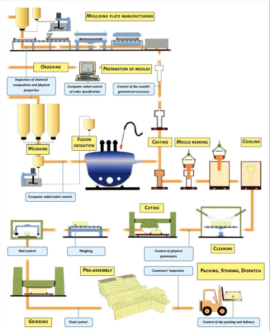 最初に、高純度に管理された原料と補助材料のバッチが電気炉で溶融されます。 溶融した材料は酸化され、煉瓦デザインを正確に形成するために型に流し込まれます。型が外されると制御されたアニーリング炉に入れられます。洗浄と研磨の後、煉瓦は個別にチェックされカスタマーへの出荷前に工場内で1度組み立てられます。 この段階で、組み立てられた炉または炉の部品をカスタマーの検査担当者はチェックする事ができます。品質確認の後、製品の仕向地および輸送手段に応じて、ブロックにマークが付けられ、発送のために梱包されます。ブロックの適切な取り付けを補助するために、組立図および写真が顧客に提供されます。